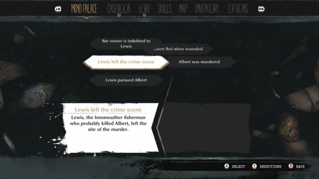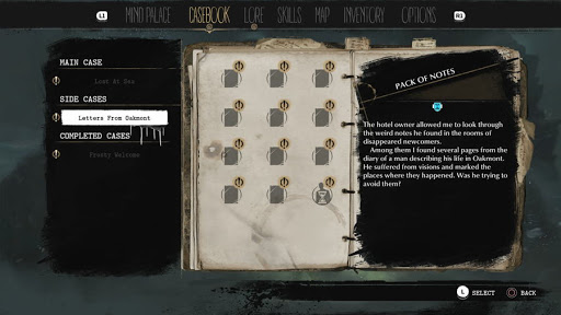 Wyjątkową i odróżniającą Sinking City od innych gier jest mechanika śledztwa. W panelu gracza mamy dostępne dwa główne ekrany tj. Teczkę z aktami, czyli wszystkie informacje dotyczące wykonywanych zadań oraz Pałac Umysłu, w którym łączymy ze sobą poszczególne wskazówki by dojść do wniosków, a w następstwie podjąć istotne w grze decyzje. Poszukując wskazówek korzystamy z archiwów Biblioteki, Ratusza czy Szpitala, czyli typowy chleb codzienny dla każdego Badacza Tajemnic. Same zagadki nie są trudne, ale również nie jest to poziom dla idiotów, także ich rozwiązywanie daje satysfakcję. Wybory zaś są odpowiednio niejasne, tak że często podejmując, je nie mamy komfortu psychicznego.